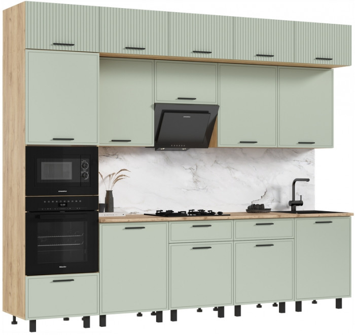 Модульная кухня в элегантном сочетании олива софт/дуб крафт – современное решение для создания уютного и функционального кухонного пространства. Цветовое решение включает фасады в контрастном оттенке олива софт, корпус в натуральной древесной текстуре дуб крафт и столешницу дуб вотан как стильное дополнение общей композиции. Материал фасадов выполнен из МДФ 16 мм и стекла, корпус из ЛДСП 16 мм, столешница из ДСП толщиной 26 мм с помодульной конструкцией, направляющие ящиков шариковые полного выдвижения, высота ножек/опор составляет 10 см.