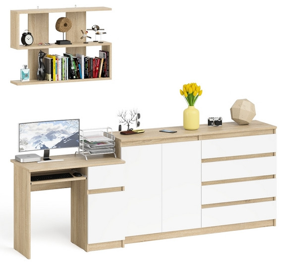 Тумба-комод с дверками и ящиками на 1600 со столом с тумбой и ящиком справа и навсеной полкой Мори. Цвет - дуб сонома/белый. Габариты (ШхГхВ) 250,4х50х209,6 см. Не универсальная сборка. Тумба стола справа имеет нишу с полкой за дверкой и ящик на роликовых направляющих. Комод оборудован 4 ящиками с одной стороны и закрытым отделением с полкой за 2 распашными дверками. 3 полки с боковыми стенками по диагонали соединеных 2 задними панелями.